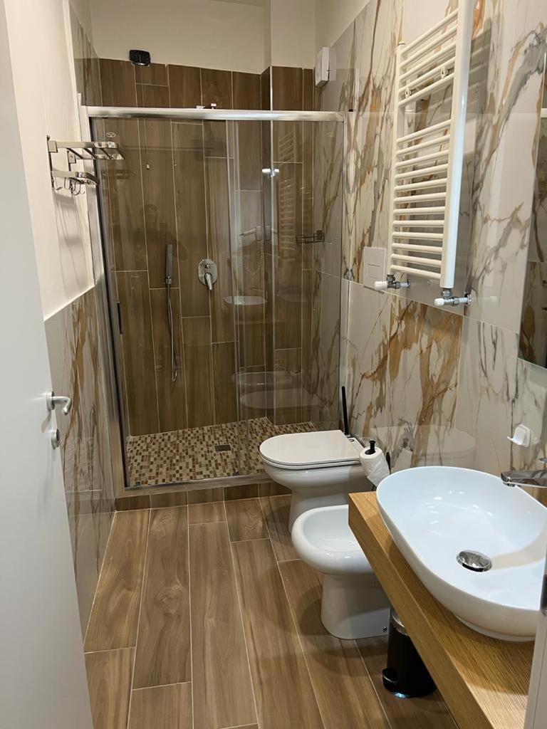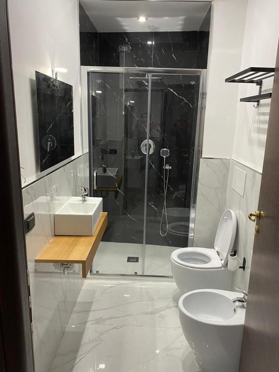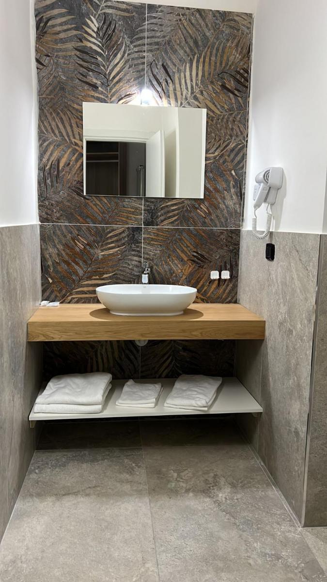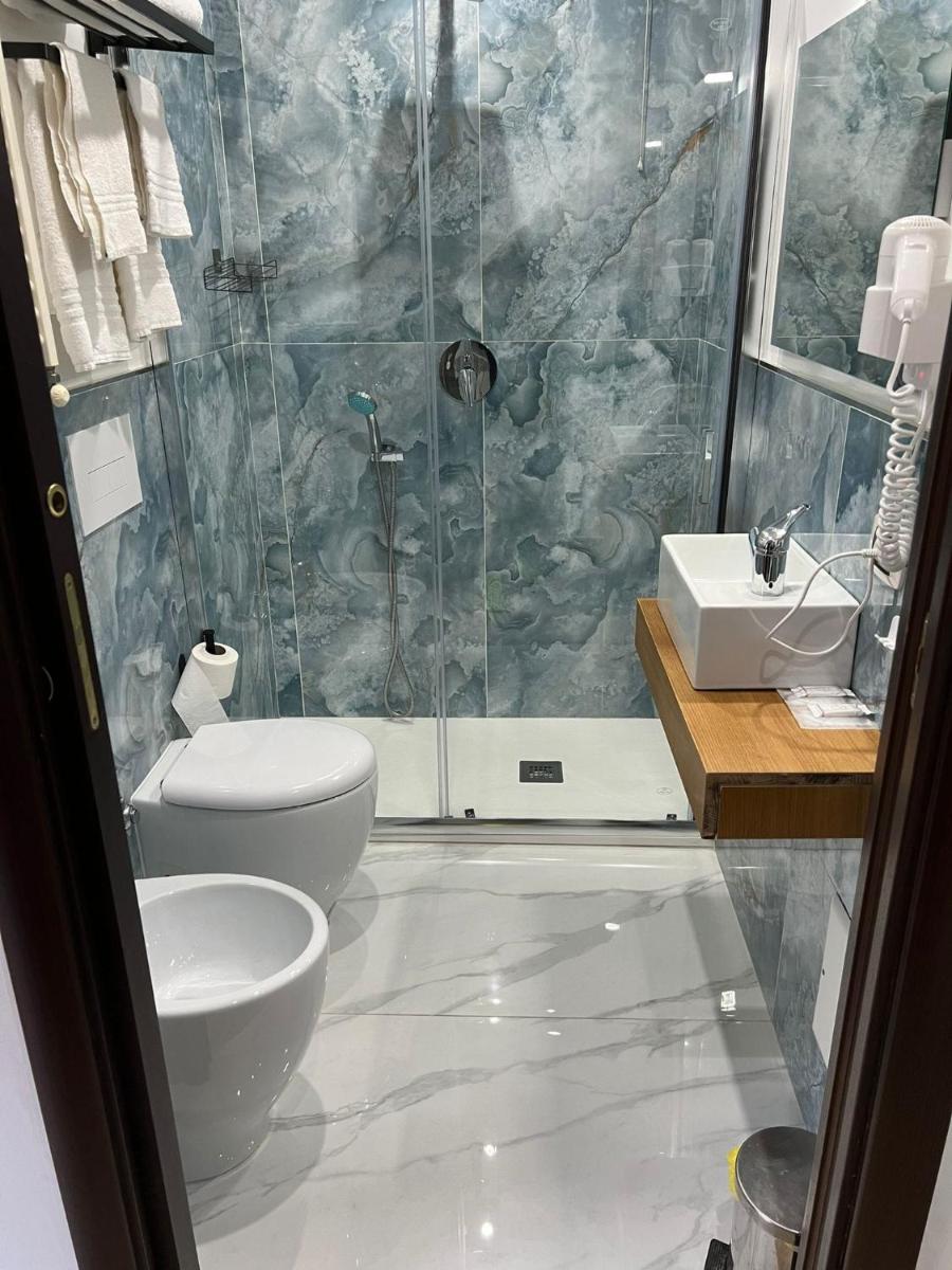 Photos showcase air-conditioned rooms with flat-screen TVs and minibars. Bathrooms are compact, fitted with showers. The breakfast area is modest but bright, set up for continental service. Exterior shots emphasize the hotel’s urban setting near Capodichino Airport.